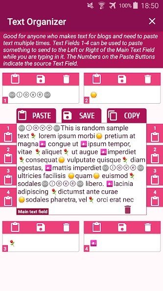 - Text Organizer: Good for anyone who makes text for blogs and need to paste text multiple times. Text Fields 1-4 can be used to paste something to send to the Left or Right of the Main Text Field while you are typing in it.